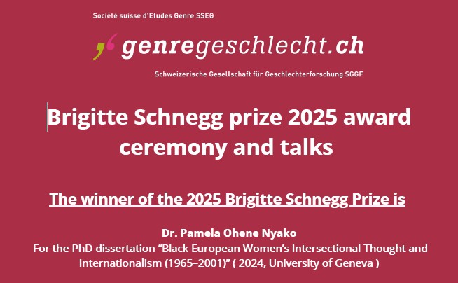 Die Schweizerische Gesellschaft für Geschlechterforschung SGGF verleiht den Brigitte-Schnegg-Preis an Pamela Ohene-Nyako für ihre hervorragende Dissertation "Black European Women’s Intersectional Thought and Internationalism (1965–2001)". Die thematische Relevanz und die gesellschaftspolitische Bedeutung der Arbeit wurden besonders gewürdigt!